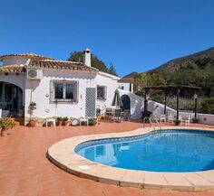 Cette villa traditionnelle impeccable, ensoleillée toute la journée, est située dans une rue calme en cul-de-sac à la périphérie de Moraira, à seulement quelques minutes à pied des commerces et restaurants. La propriété se trouve sur un grand terrain plat et rustique, ce qui signifie qu’elle ne peut pas être agrandie, avec une vue dégagée magnifique sur la vallée jusqu’aux montagnes, et même une vue partielle sur la mer.Depuis la route d’accès, une petite allée offre un parking suffisant et mène à un garage avec espace de rangement. Depuis le garage, un chemin plat mène à un escalier de neuf marches qui donne accès à la villa et à la terrasse avec piscine.Vous entrez par une naya ouverte avec une vue splendide, un endroit idéal pour profiter des couchers de soleil à l’ouest. La porte d’entrée mène directement au spacieux salon avec cheminée et une fenêtre donnant sur la piscine. Une arche mène à la salle à manger, un espace lumineux avec des portes vitrées vers la naya et une fenêtre. À gauche du salon se trouve la cuisine, équipée d’armoires crème brillantes et de plans de travail en granit, comprenant un four, une plaque de cuisson au gaz, une hotte télescopique, un lave-vaisselle de 45 cm, une machine à laver et un réfrigérateur. Il y a aussi un cellier.Un couloir mène aux chambres et à la salle de bain. D’abord, la deuxième chambre, une pièce spacieuse avec armoires encastrées, climatisation et fenêtre donnant sur l’arrière du jardin. Ensuite, la salle de bain magnifiquement rénovée avec douche à l’italienne, meuble-lavabo avec vasque en verre noir et sèche-serviettes électrique.La terrasse de la piscine est privée et très spacieuse, avec une vue ouverte splendide. Elle dispose d’une pergola pour se détendre à l’ombre, une table avec des chaises pour les repas en plein air, un barbecue, une table basse avec des fauteuils, et suffisamment d’espace pour des transats.Le terrain autour de la villa est composé de pelouse, plantes, arbustes et plusieurs amandiers – il y a tant à faire avec tout cet espace disponible. Il existe un accès à un espace de rangement sous la naya avec une hauteur sous plafond limitée.